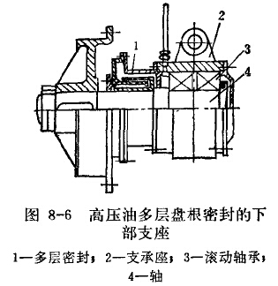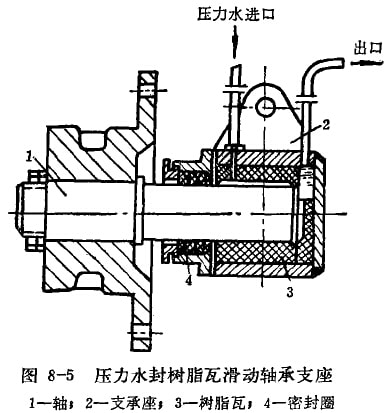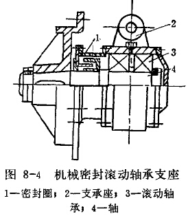 下部支座长期沉没在矿浆中,因而轴承的密封装置是保证设备正常运转的关键问题。目前,常用的下部轴承的密封装置有三种,即机械密封滚动轴承支座(图8-4)、压力水封树脂瓦滑动轴承支座(图8-5)及压力水封橡胶轴衬(一船用皮带机废肢带组叠而成)。这些结构型式的密封性均不够理想,最近,在机械密封滚动轴承支座的基础上,用手动干油泵注入高压油,寿命可达1年左右,其结构如图8-6所示。