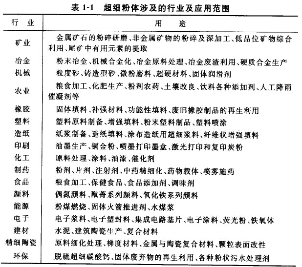 超细粉体工业是多学科的组合,超细粉体几乎应用于国民经济的所有部门,表l-l为超细粉体涉及的行业及应用范围。