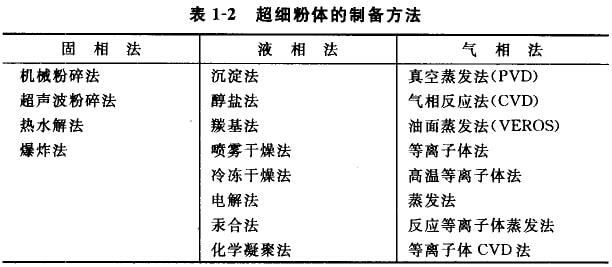 因为超细粉体具有优良的性能和广泛的用途,所以人们研制了许多的制备方法。主要制备方法见表1-2。