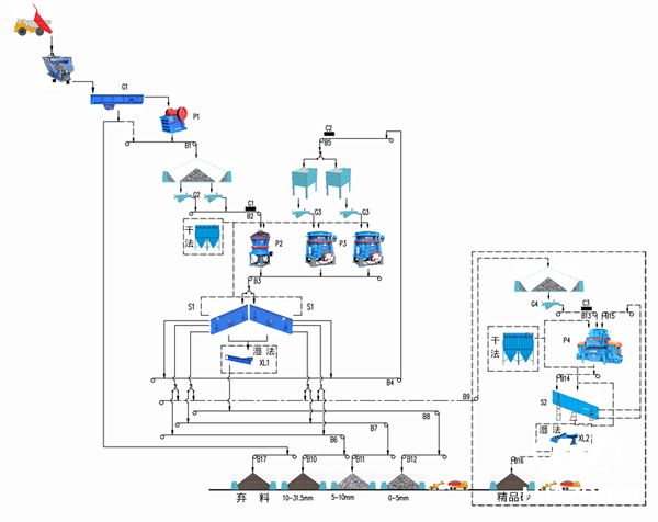 振动给料机→JC颚式破碎机→GPY单缸液压圆锥破碎机→HPY多缸液压圆锥破碎机→筛分→PLS立式冲击破碎机→筛分。
