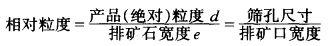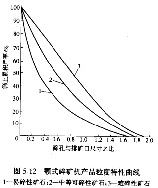 该曲线是由大量生产数据的平均统计得来的。生产实践证明,用同一类型碎矿机破碎矿石,产品的粒度特性曲线形状取决于被破碎物料的性质,主要的是它的硬度。因此在没有实际资料的情况下,可以运用这三种典型粒度特性曲线。为了运用方便,横坐标不是直接用粒度的绝对值表示,而是用相对粒度表示。它们之间的关系如下: