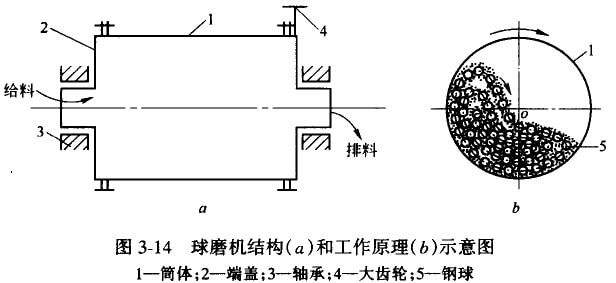 圆筒形球磨机在细磨中应用员为广泛,图3-14所示为球磨机的结构和工作原理。主要由圆柱筒体、端盖、中空轴颈、轴承和传动大齿圈等部件组成。筒体内装有直径为25-150mm钢球,其装入且是整个筒体有效容积的25%-50%。筒体内壁设有衬板,除防止筒体磨损外,兼有提升钢球的作用,筒体两端的中空轴颈有两个作用:一是起轴颈的支撑作用,使球磨机全部重量经中空袖颈传给轴承和机座;二是起给料和排料的漏斗作用。电动机通过联轴器和小齿轮带动大齿圈和筒体以一定转速转动。