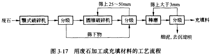 图3-17所示为以破碎废石作为井下胶结充填骨料的工艺流程。加工废石先经600mmx900mm颚式破碎机粗碎,粗碎产品经1250mmx2500mm惯性振动筛分机分级后,大于50mm的筛上产品者再经标准圆锥破碎机破碎后再经1250mmx2500mm惯性振动筛分机,25-50mm筛分产品作为成品碎石,可作为混凝土胶结骨料或水砂充填用。小于25mm的筛下产物进一步用棒磨机细磨,磨后用筛分机分级,-3mm+37μM的粒级为成品砂,可供胶结充填作细骨料之用,-37μM以下的细泥丢弃,排入尾矿坝。
