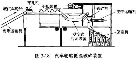 图3-18所示为废汽车轮胎的低温破碎工艺。经皮带运输机送来的废轮胎采用穿孔机穿孔后,经喷洒式冷却装置预冷,再送浸没式冷却装置冷却。通过辊式破碎机破碎分离成“橡胶和夹丝布”与“车轮圆缘”两部分,然后送至装有磁选机的皮带运输机进行磁选;前者经锤破机和盘磨机二次破碎后送筛选机分离成不同粒度至再生利用工序。