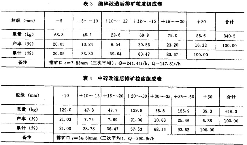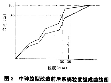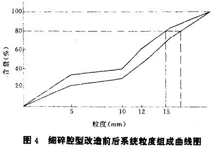 (4)检测计算表明:细碎腔型改造后,处理每吨原矿新生-15mm粒级含量提高0.15t,每小时新生-15mm粒级增加51.83t,通过能力略有增加。