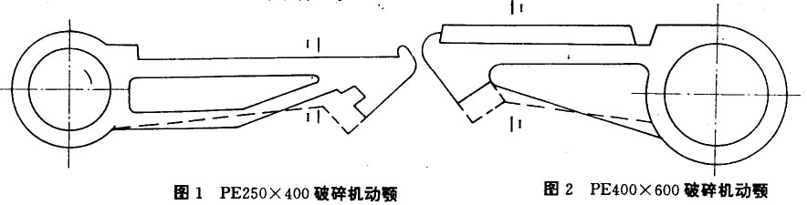 据统计国内大约100余家生产颚式破碎机的厂家,有些还是采用50年代从苏联引进的技术生产破碎机。有的破碎机动颚结构不尽合理,使动颚沉重而强度又较低,从而降低其使用寿命,浪费原材料,例如PE250×400PE400×600颚式破碎机动颚结构(图1、2)均不合理。