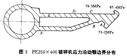 经动颚结构有限元分析,求得应力沿动颚边界分布如图3所示。从图中看出,在肘座附近A、B、C三点应力最大,故动颚常在此处损坏,而D、E、F三点应力较小,且与前三点应力差值太大。