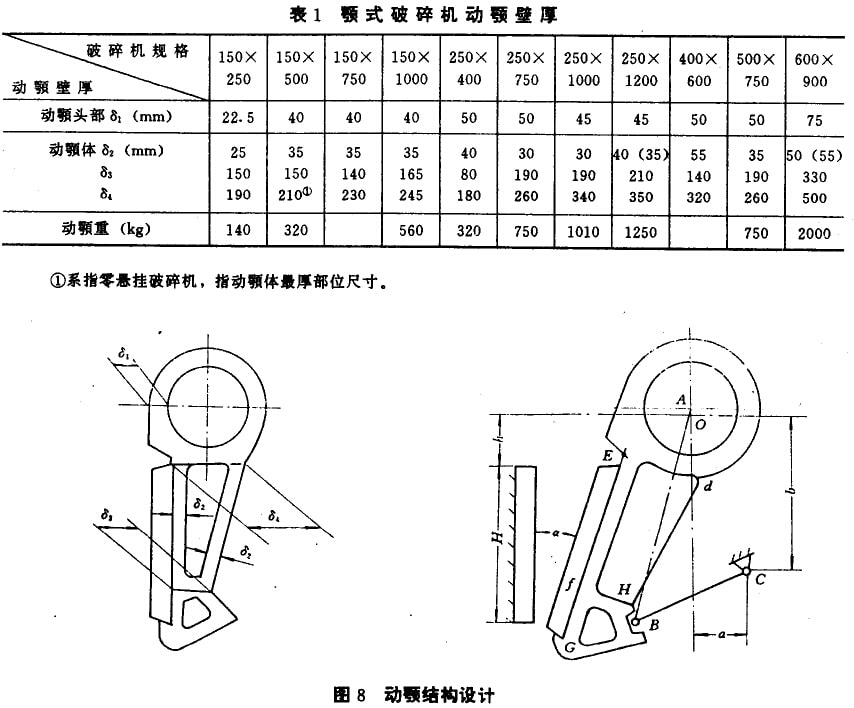 动颚体的壁厚可根据强度计算并考虑刚度来选定。还可参考实际数据(表1)选定。