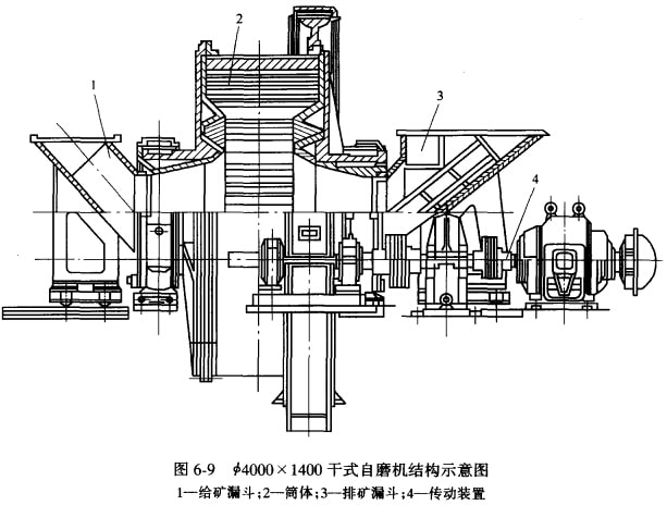 干式自磨机如图6-9所示。主要由给矿漏斗、筒体、排矿漏斗及传动装置、润滑装置等组成。 干式自磨机与球磨机比较其结构特点如下: