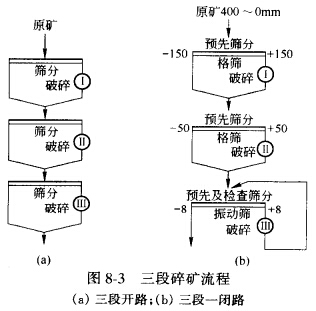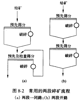 当选矿厂生产规模不大,且第一段碎矿机生产能力有富余时,第一段可不设预先筛分,即选用第一段不设预先筛分的两段一闭路碎矿流程。而两段开路碎矿流程,只有在某些重力选矿厂将碎矿产物直接送到棒磨机进行磨矿时才采用。