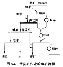 因原矿性质不同,洗矿方式及对细泥的处理方法不同,所以流程也是多种多样的,如图8-4所示。原矿为矽卡岩型铜矿床,含泥为6%~8%,含水在8%左右,其碎矿流程为三段一闭路。为了碎矿机能安全正常的工作,第一次洗矿在格筛上进行,筛上产物进行粗碎,筛下产物进入振动筛加水冲洗,振动筛的筛上产物进人中碎,中碎后进入第三段闭路碎矿。 振动筛的筛下产物进入螺旋分级机分级脱泥,分级返砂与最终碎矿产物合并进入下一段磨矿。 分级溢流进入浓缩机、缓冲及脱水后,单独进行矿泥的磨矿和选别。