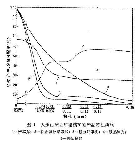 我国铁矿资源丰富,但富矿少贫矿多。在贫铁矿小,有用矿物以磁铁矿为主,脉石矿物以石英为主的鞍山式磁铁矿的量很大且分布较广,这类矿石的储量及)开采量约占全国铁矿的二外之一。由于磁铁矿性脆易磨碎,而石英较硬及韧性较大, 不易磨碎,结果在磨矿过仍小产今明显的选择性磨碎现象,使磨矿产品中磁铁矿的粒发细,石英粒度粗;磨矿产品的这种粒度分布特征也反映在粗精矿中。图1是鞍钢大弧山选厂磁铁矿粗精矿的产品粒度、品位及钦金属分布的特性曲线。由图可以看出,细级别合铁高,合硅低,产率大;粗级别则含铁低,含硅高,产率小。可见,由于选择性磨碎作用的结果,使粗精矿在粗细两个级别出现了铁及硅的质量分离现象。如果选择一个恰当的被级分离点,使可以得到质量万同的两个产品,起到分选作用。从图l中看出,若分离点选为0.074MM(200目),用细筛将此粗精矿分成筛上及筛下产品,则可得到产率80.5%、合铁67%、合硅30%左右及回收率88.6%的高质量铁精矿(筛下产品)。长沙黑色金属矿山设计院作过分析,采用细筛筛选再磨粗精矿,可以使铁精矿品位提高2—3%,而每提高1%铁品位,SiO2含量下降1.1—1.3%,焦比降低2%,高炉利用系数增加3%,渣量减少50kg左右。在不增加选矿投资、不增加选矿加工费用及不改变其他选矿指标的条件下,可使每吨生铁成本降低1.3—1.9元,生铁综合投资下降3—3.7,总费用减少12—15元。如果所有鞍山式磁铁矿选厂均采用这一措施,全国标年生产生铁的总费用将下降2.5—3亿元。由于这一措施简易可行,且具有明显的经济效益,所以目前我国东北及华北地区已有二十多个黑色金属矿山安装了2000多台细筛投入生产。武钢矿山研究所与金山店铁矿合作,利用磁铁矿易磨粒度细的特点,进行了细筛工艺的小型试验及工业试验,并获得了好的经济效果:铁精矿品位平均提高2%左右,二氧化硅含量降低5%,合硫降至0.3一0.4%以下,而铁的回收本未受影响。一个系列(按原矿台时产量116.3t计)每年可盈利22万元左右。应指出的是,上述厂矿仅利用了选择性磨碎现象,并没有注意调节这种现象,如果对这种现象加以调节,效果将更显著。