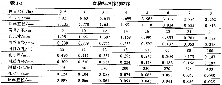 我国通常采用泰勒标准筛,其筛孔大小用网目来表示。网目是指一英寸长度内(lin=25.4mm)所具有的筛孔数目。网目越多筛孔越小。这种筛子是以200目(筛孔宽为0.074mm)作为基本筛,筛孔由上到下逐渐减小,构成筛序。两个相邻筛子的筛孔尺寸之比称为筛比,泰勒标准筛有两个筛比,即基本筛比和补充筛比。补充筛比即在筛比为√2的基本筛序户间又插入一套筛比为√2的附加筛序构成。筛孔尺寸可根据筛比计算。例如计算基本筛的—卜一基本筛序为150目的筛子筛孔尺寸时,用基本筛的筛孔乘以基本筛比确定,即0.074x√2=0.104mm。若计算两筛之间的补充筛筛孔尺寸,则用基本筛的筛孔尺寸乘以补充筛比得到,即0.074x4√2=0.088mm。泰勒标准筛的筛序列于表1-2中。