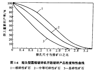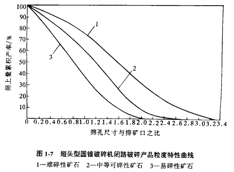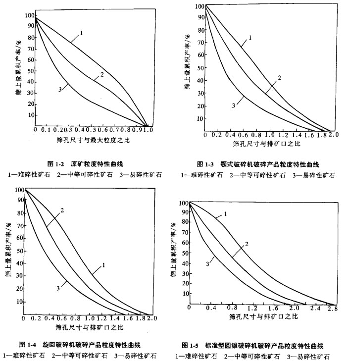 如图1-2—图l-7所示,从粒度特性曲线图中看出,难碎性矿石的粒度特性曲线1都是凸形曲线,这表明矿石中粒度较大的粒级占的质量百分数较大;中等可碎性矿石的粒度特性曲线2都近似于直线,这表明矿石中各种粒级所占质量的百分数大致相等;易碎性矿石的粒度特性曲线3都是凹形曲线,这表明该矿石中细粒级所占质量的百分数比较大。根据粒度特性曲线,可比较各种矿石的破碎难易程度,检查破碎机械的工作情况,比较各种破碎机的破碎效果。