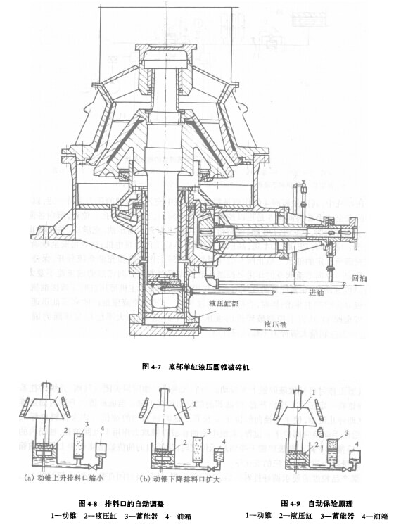 这种破碎机排料口的调整是通过油缸中袖量的增加或减少校动锥上升或下降,从而使排料口减小或增大,如图4-8所示。