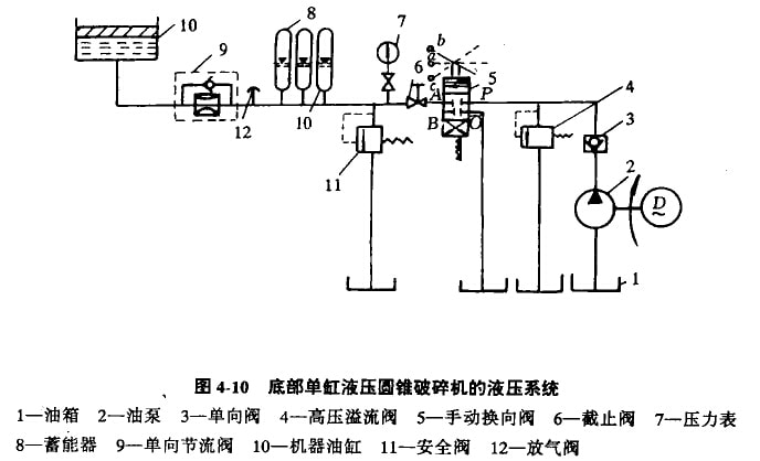 非破碎物排出后,气体压力又高于油压,则进入蓄能器内的油又被压回伯缸,使破碎锥恢复正常工作位置。这种破碎机的液压系统如图4-10所示。