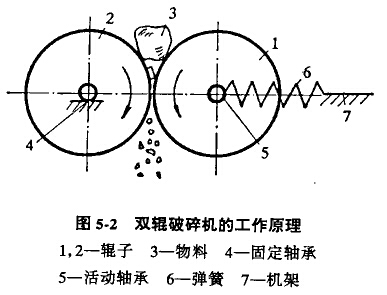 以图5-2所示的双辊破碎机为例来介绍其工作原理。辊子2支承在固定轴承4上,辊子1支承在活动轴承5上。活动轴承5借助弹簧6推向左方的挡块位置处。两辊子由电动机带动相向转动,物料经给料箱给入两辊子之间。物料由于受辊子与物料之间摩擦力作用,而被带入两个辊子之间的破碎腔内,受挤压破碎后,自下部排出。两辊子之间的最小间隙称为排料门宽度,破碎产品的粒度即由它的大小来决定。