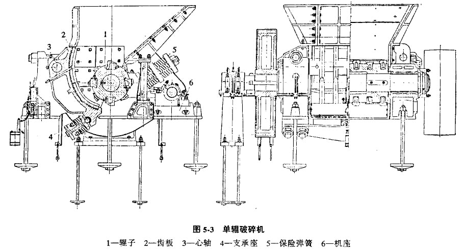 单辊破碎机又称颚辊破碎机,构造如图5—3所示。单辊破碎机是由一个转动的辊子1和一块齿板2组成。破碎机的辊子1表面镶有许多牙齿,以增加啮入料块的尺寸,牙齿磨损后,可以拆下更换新的。与辊子构成破碎腔的齿板2和颐式破碎机的动颚相似,其上端悬挂在心轴3上,下端支承在和保险弹簧5相联接的支承座4上。当掉入非破碎物时,齿板挤压支承座,支承座再通过螺杆、螺帽和压板继续压缩弹簧而增大排料门,使非破碎物排出去。非破碎物排出后,借助弹簧的作用,使徘料n又恢复到原来的大小。辊子轴的两端支承在装于机座6两侧壁内的滑动轴承上,电机通过三角皮带和一对齿轮带动辊子转动。破碎机的传动拍轴承和传动齿轮采用稀油润滑,辊子铀和心铀轴承采用半自动干泊集中润滑。