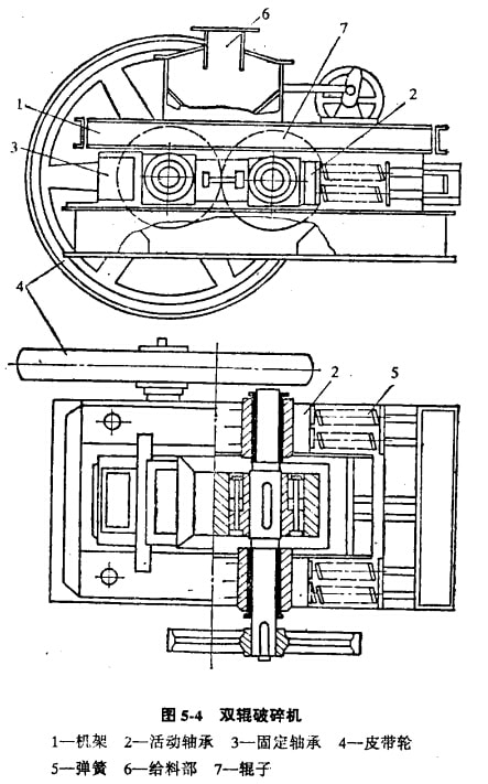 常用的一种辊子破碎机是双辊破碎机,它的构造如图5-4所示。它由机架、一对辊子、三角度带传动装置和弹簧保险装谨等之要部件组成。两台电机通过皮带轮4传动,带动两辊子7相向转动。一个辊子的油文求在与机架固定在一起的固定轴承3上,另一个辊子的轴支承在活动轴承2上。活动轴承2可以沿机架寻轨水平移动,使两辊子间的排料口宽度在必要时可以增大,将非破碎物排出机外。