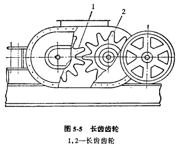 图5-4所示双辊破碎机的每个辊子都由单独的电机带动。也有使用一台电机通过皮带传动带动固定辊子,固定辊子袖的另一端装有齿轮,通过齿轮带动活动辊子。由于物料性质的变化使活动辊子左右移动,所以齿轮齿高必须增加,以防啮合脱离。双辊破碎机采用的长齿齿轮传动如图5-5所示。它的特点是允许运转中改变中心距而不破坏啮合特性。