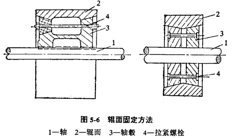 辊式破碎机的辊子由辊面、轴毅、锥形孤铁、主轴等主要部件组成。轴鼓心部用镕与主轴连接,外表面呈锥形,与辊面的钱孔配合。利用三块锥面弧铁、螺杆、螺帽等零件,使辊面与轴教紧紧地结合在一起。辊面用高锰钢,镍硬白口铸铁、高银白口铸铁等材料制造。图5-6是一种辊面与轴毅固定方法的示意图。