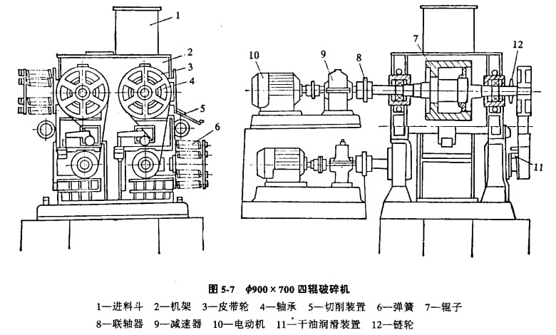 四辊破碎机实质上是由两台规格相同的双辊破碎机里叠组成的。图5-7是φ900x700四辊破碎机结构。从辊子7的构造和弹簧保险装置6上看,它与对辊机没有什么区别。但是,它的辊子轴是支承在自动调心滑动轴承4上;它的传动装置是由两台电机10、两台减速机9、两套皮带轮3传动组成的。