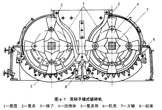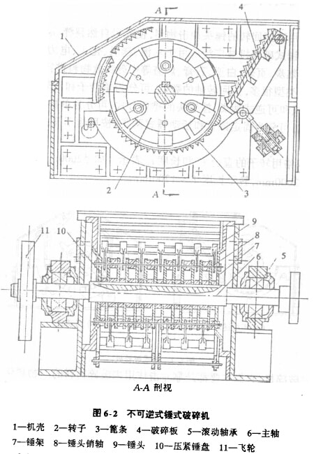 图6-2是单转子不可逆式锤式破碎机。它由机壳1、转子2、篦条3、打击板4和轴承5等部分组成。