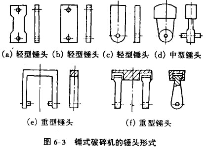 图6-3中的(a),(b),(c)是轻型锤头,质量通常为3.5一15kg,多用来破碎粒度为100-200mm的软质相中等硬度物料,其中(a),(b)两种两端带孔,磨损后可以调换4次使用,而(c)只能调换2次使用。图6-3中的(d)为中型锤头,质量为30-60kg,用来破碎800mm-1000mm的中等硬度物料。图6-3中的(e),(f)是重型锤头,质量达50-120kg,主要用来破碎大块和坚硬物料。锤头用高碳钢锻造或铸造,也可用高锰钢铸造,为了提高耐磨性,采用高锰低合金钢,有的在锤头工作表面上涂焊上一层硬质合金。近来有的用高铬铸铁锤头复合铸造,即锤柄采用ZG45钢,而锤头采用高铬铸铁,而耐磨性比高锰钢锤头提高数倍。