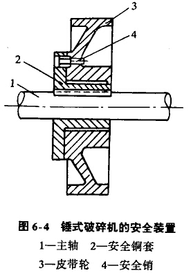 锤式破碎机的安全装置如图6-4所示。在破碎机的主轴上装有安全铜套2,皮带轮3套在铜套上,铜套与皮带轮则用安全销4连接,当破碎机内进入金属物或过负荷时,安全销即被剪断而起保护作用。安全销的材质应按规定或经过实践验证,不能用强度过大的材料作安全销,以防止进入金属物后安全销不断裂,损坏其他零件和造成大的事故。