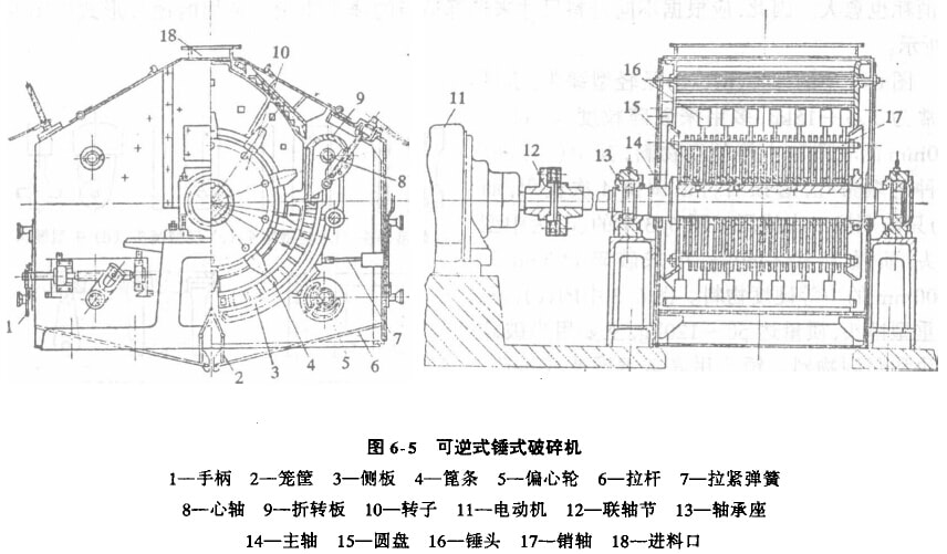 为了克服这个缺点,在许多工业部门中,采用可逆锤式破碎机。这种破碎机的转子可从正、反两方向回转。当锤头某一面磨损后,只要将电机反转,破碎机仍能继续照常工作。这就增加了锤头的使用寿命,提高了破碎机的作业率,增加了生产能力。但是,可逆式锤式破碎机的结构却比较复杂一些。
