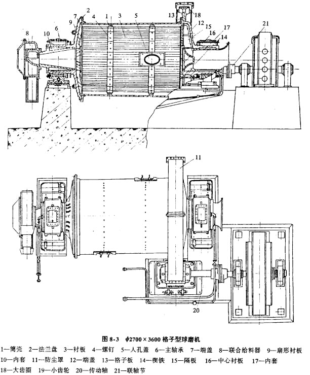 各种类型的球磨机、棒磨机和砾磨机的构造基本相同,它们之间仅是个别部件不同而已。φ2700 x 3600格子型球磨机的构造如图8-3所示,它由筒体部、给料部、排料部、轴承部、传动部和润滑部六个部分组成。