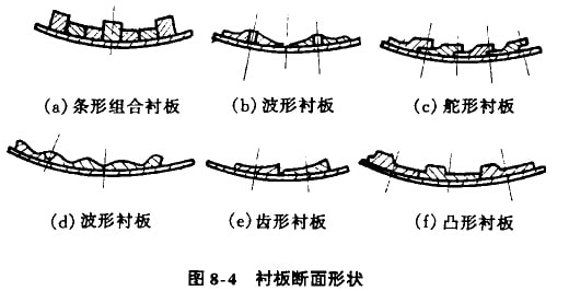 磨机衬板的结构形式及互相间的安放位置,都直接影响着磨机的工作效率。磨机衬板的厚度范围为50mm-150mm,其结构形式和尺寸,须按磨帆的用途和工作特点,并适当考虑制造、安装和搬运方便的原则来选取c为保证磨机生产的稳定性,要求磨机衬板在被磨损到一定积度时,仍能较好地保持原有的结构特性。如图8-4所示,为常用的几种磨机衬板的形式。
