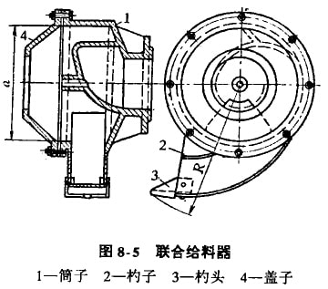 给料部:给料部的作用是将被磨物料相分级返砂迅速给入磨机中。给料部是由带中空轴颈的端盖7、联合给料器8、扇形衬板9和轴颈内套10等组成。端盖内表面上敷有扇形锰钢衬板9,各衬板之间留有一定间隙颈(约15mm),以便于安装和拆卸,衬板用螺钉直接固定在端盖上。中空轴颈内销有一个内表面带螺旋叶片(也有不带螺旋叶片的内套,主要根据巾空轴颈粗细而定)的铸造内套,它们中间垫着衬垫,内套保护中空轴颈不受磨损,螺旋叶片随筒体旋转而把料送入筒内,为了防止内套与筒体相对转动,用螺钉把它固定在中空轴颈的端部,给料器8(如图8-5所示)则用螺钉固定在内套的端面上。