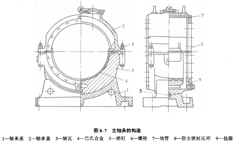 润滑油由集中润滑系统以一定的压力进入轴承盖上方的油管7中,油管7上有哨油孔,润滑油由喷油孔喷注到个空轴颈的外表面上,润滑后流集在下轴瓦的油槽内,从排油管流回油箱。为厂防止灰尘从轴颈与轴承间的间隙进入轴承,在主轴承的端面放毛毡密封圈,并用由两半拼成的密封环9固定住。