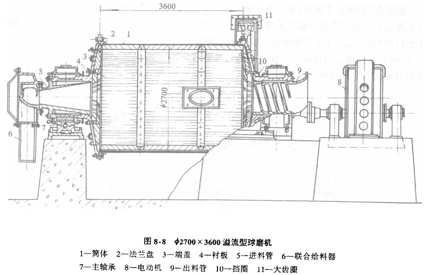 φ2700 x 3600溢流型球磨机的构造如图8-8所示,除排料部与格子型球磨机构造不同外,其他部分基本相同。