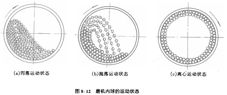 粉磨介质在低转速筒体中作泻港运动时,所有介质向着筒体旋转方向偏斜大约40°-50°的角度,全部粉磨介质在保持这个位置的同时,在其中自然形成的球层大体上沿同心圆分布,各层球沿此同心圆的轨迹升高,当介质超过自然休止角后,就泻落下来,这样不断地反复循环着。在介质泻落运动状态下,物料主要是由介质的互相滑滚运动产生压碎及研磨作用而被粉碎的。在水泥工业中应用的水泥磨一般采用这种状憨工作。如图8-12(a)所示。