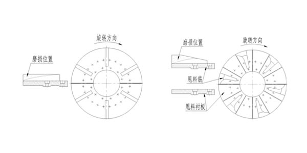 老型PFL的甩料盘结构如图1所示:由于甩料盘的筋靠近圆周边缘的切线速度比内侧要高、磨损要快,材料利用率很低(不足10%),甩料盘筋的形状和磨损位置如图1所示。