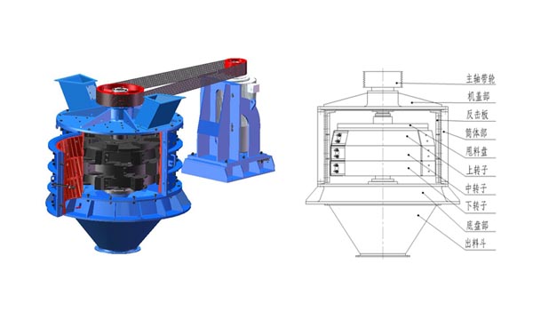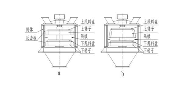 环形隔板或篦板的作用是:物料通过第一破碎腔破碎后,在环形隔板或篦板上自然形成堆积角,将物料导向下甩料盘,使其二次加速重复上一级的破碎过程。由于筒体高度的局限性,使上、下转子间距较小,环形隔板或篦板距上转子锤头太近,不但形不成自然堆积角,反而经常引起堵料和上锤头的过度磨损。