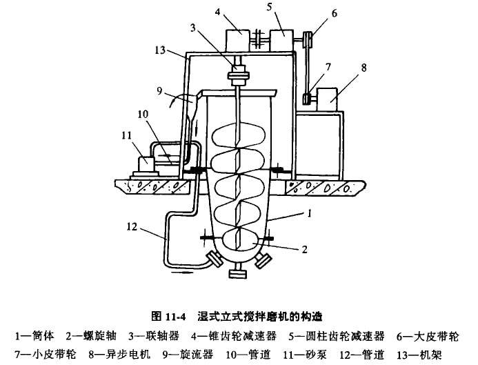 湿式立式搅拌磨机的构造如图11-4所示。它由垂直不动的筒体1、悬垂在筒体中心的螺旋轴2、联轴器3、锥齿轮减速器4、圆柱齿轮减速器5、大皮带轮6、小皮带轮7、异步电机8、旋流器9和砂泵11等组成。在筒体I内充填粉磨介质,筒体内的螺旋轴2由电机遇过皮带轮、减速器和联铀器的带动而旋转。由于螺旋抽的旋转,使粉磨介质沿螺旋面上升并作不规则地翻滚运动,因筒体内壁与螺旋轴之间有间隙,粉磨介质上升到一定高度后离开螺旋面,在重力作用下粉磨介质沿筒体内壁下降,然后再沿螺旋面上升,在如此上下循环的往返过程中,将加入筒内的物料,由粉磨介质相互之间的冲击、挤压和剪切作用而磨细。磨细的物料从筒体上部出口溢流进入水力分级装置旋流器2进行分级,校流器的溢流即为粉磨产品,而粗粒产品沉向旋流器下部,通过管道10进入砂泵lI,再返回筒体内进行循环粉磨。