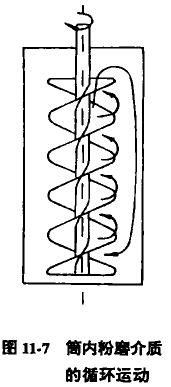 由于螺旋轴的旋转,螺旋叶片区内的介质沿叶片斜面向上运动,直至叶片顶部,又由于螺旋叶片产生的离心力将运动到顶部的粉磨介质推向筒壁与螺旋叶片外绿形成的环形区,粉磨介质在环形区内向下运动,运动到筒底后再进入螺旋,沿螺旋叶片斜面向上运动,这样便形成了自内向上、自外向下的垂直循环运动。