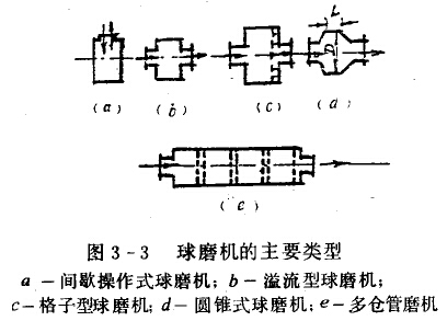球磨机的主要类型如图3-3所示。其共同点是都有一个水平放置的回转筒体,差别在于筒体形状、研解体形状、操作方法、卸料方式、筒体文水方式、传动方式和生产特点等不同,而成为各种型式的球磨机。
