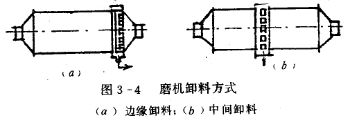 中心卸料式磨机可分为溢流型(不带卸料篦板)磨机,如图3-3b所示,格子型(带卸料篮板)磨机,如图3-3c所示。另外有边缘卸料式磨机。如图3-4a所示,磨细的物料通过卸料篦板,被辐射状布置的扬料板带起,然后经筒体出料孔卸出。中间卸料式磨机,如图3-4b所示,这种磨机是两端进料,中间卸料,在筒体中部的周壁上开孔以卸料,相当于两台边缘卸料磨机的合成。
