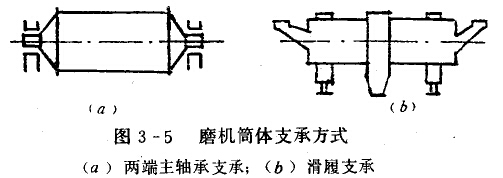 球磨机筒体两端的中空轴支承在主轴承上,如图3-5a所示,这种支承方式比较普遍。另一种为滑履支承磨机,它是通过紧固在磨筒体上的轮带支承在治履上运转,如图3-5b所示。
