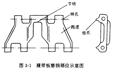 在考虑提高零件使用寿命时,应首先从改进零件的结构设计开始。不合理或不完美的设计往往会使磨损大大加剧,使用寿命明显降低。反之,有时在结构设计上稍作改进,往往会很容易或明显地提高零件的耐磨性。改善零件结构的设计方法是:应用摩擦学知识,主要是磨料磨损规律知识,合理改变零部件结构设计,即通过对磨损零件摩擦学系统分析以后,从改善磨损条件出发,适当改变零件的几何形状、配合方式以及加大其工作部分尺寸,或用特殊的工艺方法。这些参数改变后,既能满足设备正常运转,又不致增加过多消耗,使耐磨性大大提高。这已经被许多应用实例所证实。例如:50年代,拖拉机履带板都是五孔型履带板.后改为七孔履带板,将易磨损部位的节销厚度适当增加,寿命比五孔的提高了,得到普遍采用,如图3-1所示。