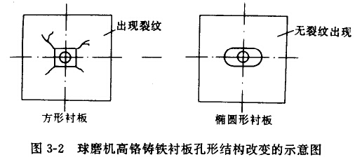 近几年来,高格铸铁材料在耐磨零件中得到广泛地应用。尽管这种材料有很高的硬度和耐磨性,然而它比高锰钢及低台金钢等材料要脆得多,如果结构设计不当,往往出于开裂造成早期失效。比如高铬铸铁制造的球磨机衬板,易由中间方孔四角裂纹扩张开裂,后改为椭圆形孔,并注意安装及使用条件,减少了应力集中和开裂,使高铬铸铁衬板,在球磨机中得到成功的应用,如图3-2所示。