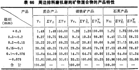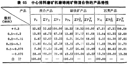例如,用1~0.5mm的纯石英及纯磁铁矿混合物(两种矿物各占50%)在中心排料球磨机及周边排料棒磨机中进行磨碎试验,结果列入表65及66。从表65及66的结果可以计算出,中心排矿时石英产品的平均粒度为0.56mm,磁铁矿产品的平均粒度0.292mm, 二者的粒度差为1.93倍,两种矿物一200目的产率差高达30.14%;而周边排矿时石英产品的粒度为0.15mm,磁铁矿产品的粒度0.146mm, 二者粒度仅差1.04倍,两种矿物极为接近,而且两种矿物一200目的产率也仅差0.71%。在中心排料磨矿机内,矿料的选择磨碎作用是加速大密度软矿物的磨碎速度,并拉大软硬矿物的粒度差;而在周边排料磨矿机内,矿料的选择磨碎作用则是减缓大密度软矿物的磨碎速度,并缩小软硬矿物的粒度差。这就是说,中心排矿方式对回收矿物密度大、且矿物 硬度低的矿石不适宜,而周边排矿磨矿机正好相反,它对回收脆 性和大密度矿物有利,具有保护脆性和大密度矿物少遭过磨及过粉碎的强烈作用。例如,钨矿石、锡矿石及锑矿石的磨矿,采用为了证明周边排矿磨矿机在生产上应用的可能性,采用实际矿石进行开路磨碎试验。试料选用云南某厂锡石硫化矿石,其中大密度且脆性大的矿物为锡石,硬度大的脉石矿物主要为辉石 (密度比锡石小得多),矿石破碎至3~0mm后在周边排料棒磨机及中心排料棒磨机中进行磨碎对比试验,其他磨机工作条件保持完全相同以便查明排矿方式对实际矿石磨碎的影响,试验结果列入表67及68。两种磨机的磨矿产品分别按同样选别条件进行选别,选别结果列入表69。此外,对云南某厂堆积多年的锡矿老尾矿进行了球磨对比试验,结果列入表70;对广西某厂的锡矿石也同样进行了棒磨对比试验,产品也同样进行选别,磨矿产品特性 及选别结果列入表71,对广西某厂的锡矿石还进行过闭路方案的对比试验。