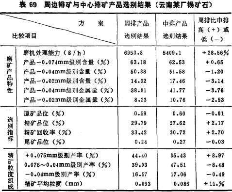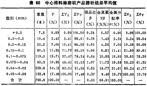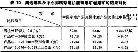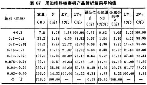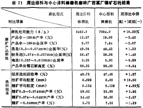 表71的结果是用广西的锡矿石做的,重复体现了表69的结 论。表70则说明,周边排料棒磨机换为装球以后仍然保持其优越性,可见这神优越性主要是磨机的排矿方式决定的。