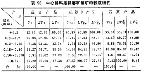 性脆易碎的大密度矿物在磨矿过松中本身就容易过磨及过粉碎,如果磨机是与水力分级设备组成闭路,则由下大密度矿物沉落速度快易在沉砂中富集,沉砂返冋磨机再磨便使大密度矿物再次遭受磨碎,这就加重其过磨及粉碎,结果在磨机排矿中使大密度脆性矿物的粒度比其他脉石矿物细得多,表93中列出了中心排料球磨机与螺旋分级机闭路磨碎磁铁矿及石英混合料(各占50%)时磨机排矿产品的粒度特性。