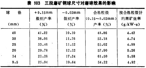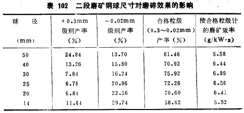 例如,用云锡公司卡房采选厂二段磨矿及三段磨矿给矿,通过试验方法确定它们的最适宜球径:二段磨给旷的最大粒度1.2mm,要求的磨矿粒度0.3mm;三段磨给矿最大粒度0.7mm, 规定的磨矿粒度0.15mm;产品中-0.02mm级别算为过粉碎级表102及表103的试验结果说明: