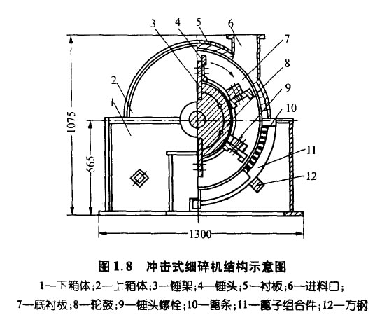 冲击式细碎机是—种锤式破碎机,具有产品粒度细、破碎比大、产量高等特点,适于将各种粒度小于60mm的中硬物料细碎到5mm 以下(占产量的80%左右)。合肥水泥研究设计院设计的CXL-ø800mm×300mm冲击式细碎机的结构如图1.8所示。